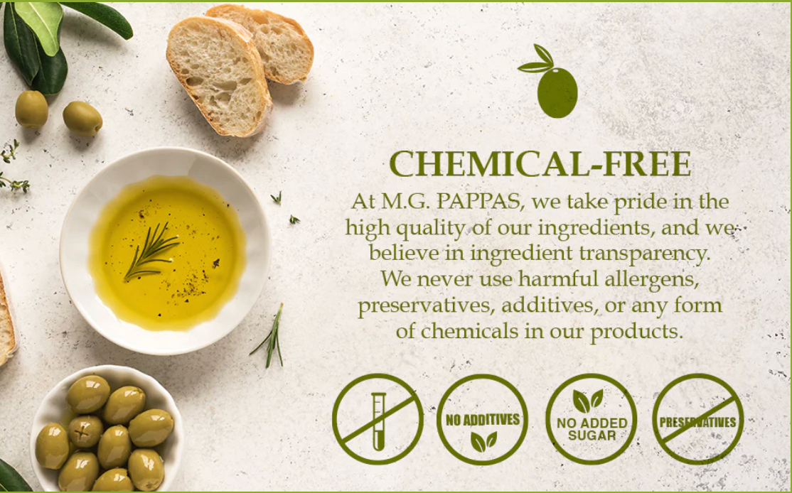 At M.G. Pappas, we are committed to delivering the purest, highest-quality extra virgin olive oil with complete ingredient transparency. Our premium cold-pressed, unfiltered EVOO contains zero additives, preservatives, or artificial chemicals—just the pure essence of hand-harvested Koroneiki olives.