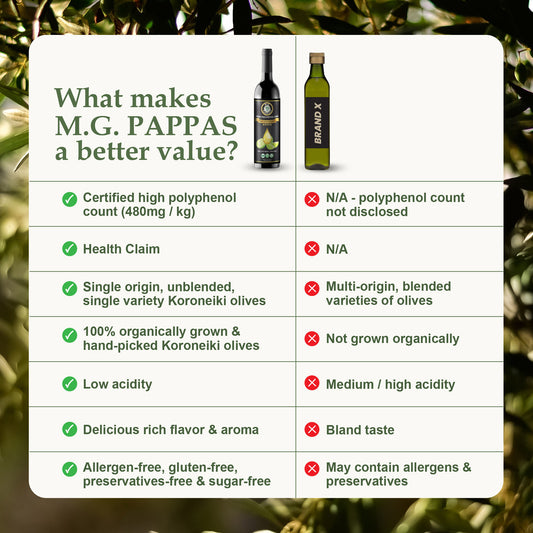 At M.G. Pappas, we are committed to delivering the purest, highest-quality extra virgin olive oil with complete ingredient transparency. Our premium cold-pressed, unfiltered EVOO contains zero additives, preservatives, or artificial chemicals—just the pure essence of hand-harvested Koroneiki olives.